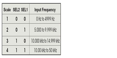 為了實現(xiàn)轉(zhuǎn)換,將輸入頻率分為四個刻度,這些刻度由輸入SEL1SEL2 (圖2手動選擇。