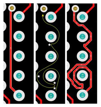 組件的放置和布線是PCB設(shè)計(jì)工具提供的原始功能,而這些功能對于當(dāng)今的設(shè)計(jì)師仍然至關(guān)重要。當(dāng)今先進(jìn)的設(shè)計(jì)工具通過交互式布線來沿光標(biāo)路徑放置布線部分,實(shí)現(xiàn)在障礙物上推動(dòng)或行走,并自動(dòng)跟隨現(xiàn)有連接,從而幫助較大化布線效率和靈活性。光標(biāo)引導(dǎo)的布線使圍繞障礙物的復(fù)雜手動(dòng)布線變得快速,輕松和直觀。用鼠標(biāo)創(chuàng)建路徑,交互式布線器會(huì)嘗試根據(jù)該路徑放置軌道。圖1顯示了如何在光標(biāo)移動(dòng)引導(dǎo)的情況下快速創(chuàng)建復(fù)雜的路線。左圖顯示了一條正常的最小長度的路線,中圖顯示了光標(biāo)路徑,星號(hào)表示單擊位置以提交路線的各個(gè)部分。正確的圖像是最終的布線。盡管是一個(gè)極端的示例,但它顯示了放置多個(gè)軌道所需的布線提交數(shù)量。
