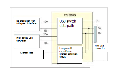 基于兩個主要原因,在此設(shè)計中需要低導(dǎo)通電容開關(guān)。首先,由于基帶處理器和高速?當(dāng)手機進入高速模式時,USB?控制器輸出在連接器側(cè)共享相同的D + / D-引腳USB 2.0模式(例如音樂下載或閃存功能),必須降低基帶USB1.1 /2.0全速控制器的輸出電容。D + / D-線上的任何附加電容都會損壞Hi-Speed的眼圖USB信號。其次,在高速USB模式下,必須切斷D + / D-線上的多余走線,以有效避免480Mbps USB信號快速上升/下降沿引起的信號反射。