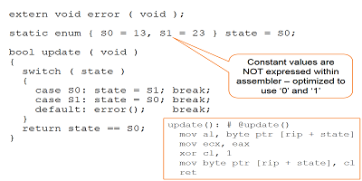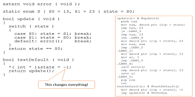 僅在初始化“ state”對(duì)象時(shí)以及在“ S0”“ S1”情況下修改“ state”對(duì)象,因此編譯器可以推斷出賦予“ state”的唯一值是“ S0”“ S1”。編譯器得出結(jié)論,不需要默認(rèn)值,因?yàn)榧僭O(shè)沒有損壞,狀態(tài)將永遠(yuǎn)不包含任何其他值-實(shí)際上,編譯器所做的正是這一假設(shè)。